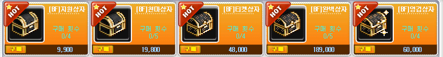 [BF]지원상자 | 가방확장(장비), 가방확장(아이템), 강화티켓 주머니, 펫먹이(3) | 9,900 | 4 | 메인 or 인기상품 |